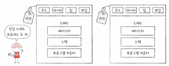 저장된 메모리 주소를 제외하면 모든 것이 동일한 프로세스 두 개가 통째로 메모리에 적재