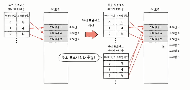 자식 프로세스는 부모 프로세스와 동일한 프레임을 가리킨다