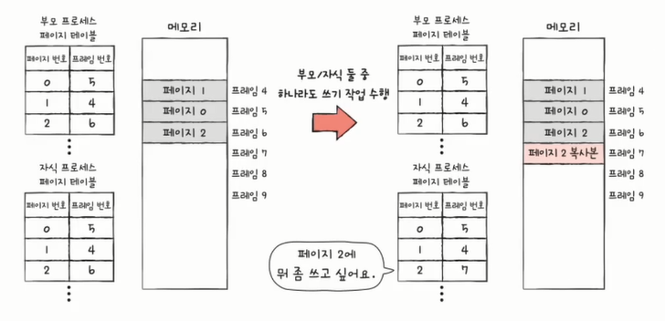 부모 프로세스, 자식 프로세스 둘 중 하나라도 페이지에 쓰기 작업 수행 시