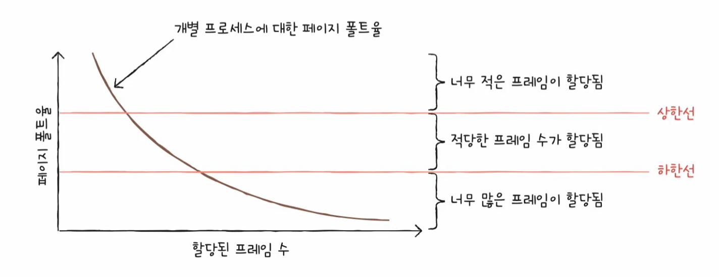 페이지 폴트율에 상한선과 하한선을 정하고, 그 내부 범위 안에서만 프레임을 할당하는 방식