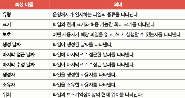 파일을 이루는 정보: 파일을 실행하기 위한 정보 + 부가 정보(= 속성, 메타 데이터)