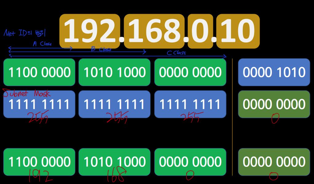 주소에서 Subnet Mask 값으로 비트 단위로 AND 연산을 하면 아래 그림과 같다