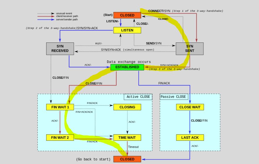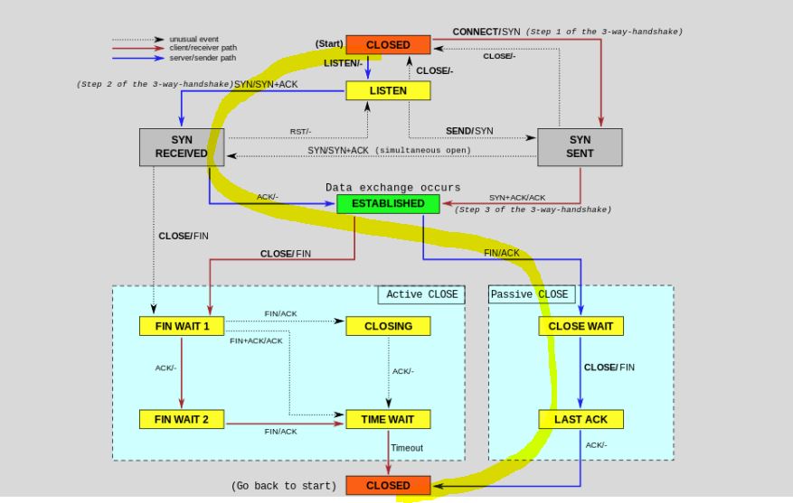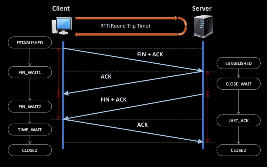 또한, 그 과정을 중에 Process들은 FIN_WAIT, TIME_WAIT, CLOSE_WAIT, LAST_ACK과 같은 과정을 거치게 된다