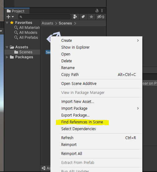 해당 에셋이 어디서 사용이 되는지 Scene과 Hierarchy 창에서 확인 가능하다