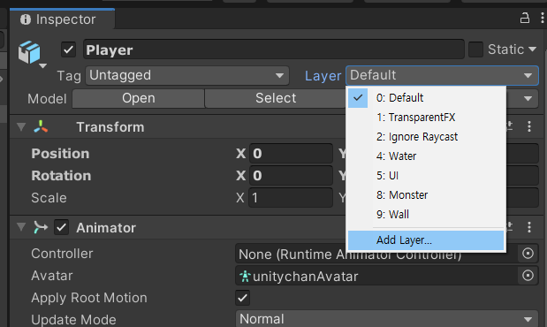 Layer를 지정해주고 싶은 오브젝트의 Inspector에서