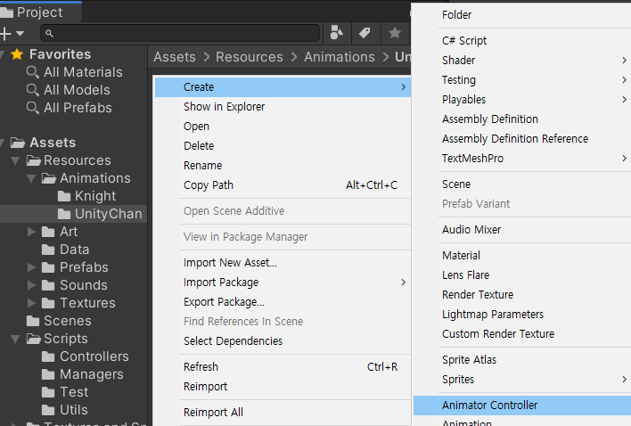 원하는 폴더 위치에서 우클릭 Create > AnimatorController 선택하면 생성된다